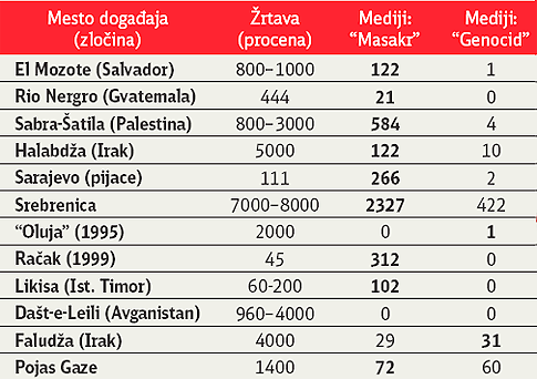 Tabela načinjena na osnovu objavljenih podataka čini još apsurdnijom – ili razumljivijom, kako vam drago – podelu genocida u kategorije zgodne za medijsku i političku manipulaciju.
