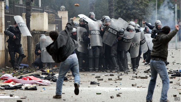 U Albaniji talasi demonstracija traju od izbora u junu 2009, za koje socijalistička opozicija tvrdi da su namešteni. Ilir Meta, zamenik premijera, podneo je ostavku 14. januara, pošto je objavljen video snimak iz marta prošle godine, gde se vidi kako on ubeđuje drugog ministra da omogući potpisivanje ugovora o izgradnji hidroelekrane, što bi obojici donelo finansijsku korist. U petak se hiljade građana okupilo na protestu, izbili su neredi i ubijena su tri demonstranta. Po svemu sudeći, ubili su ih pripadnici Republikanske garde.