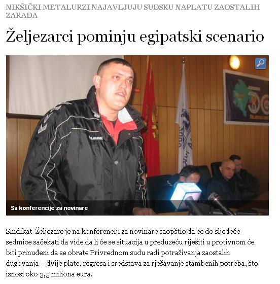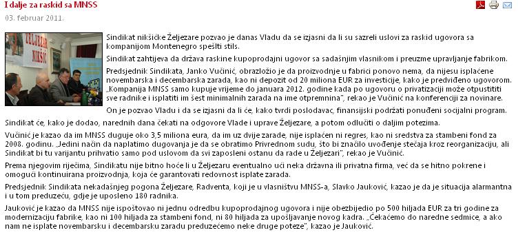 Predsjednik Sindikata, Janko Vučinić, obrazložio je da proizvodnje u fabrici ponovo nema, da nijesu isplaćene novembarska i decembarska zarada, kao ni depozit od 20 miliona EUR za investicije, kako je predviđeno ugovorom. „Kompanija MNSS samo kupuje vrijeme do januara 2012. godine kada po ugovoru o privatizaciji može otpustititi sve radnike i isplatiti im šest minimalnih zarada na ime otpremnina”, rekao je Vučinić na konferenciji za novinare.On je pozvao Vladu i da se izjasni da li će, kako tvrdi poslodavac, finansijski podržati ponuđeni socijalni program.