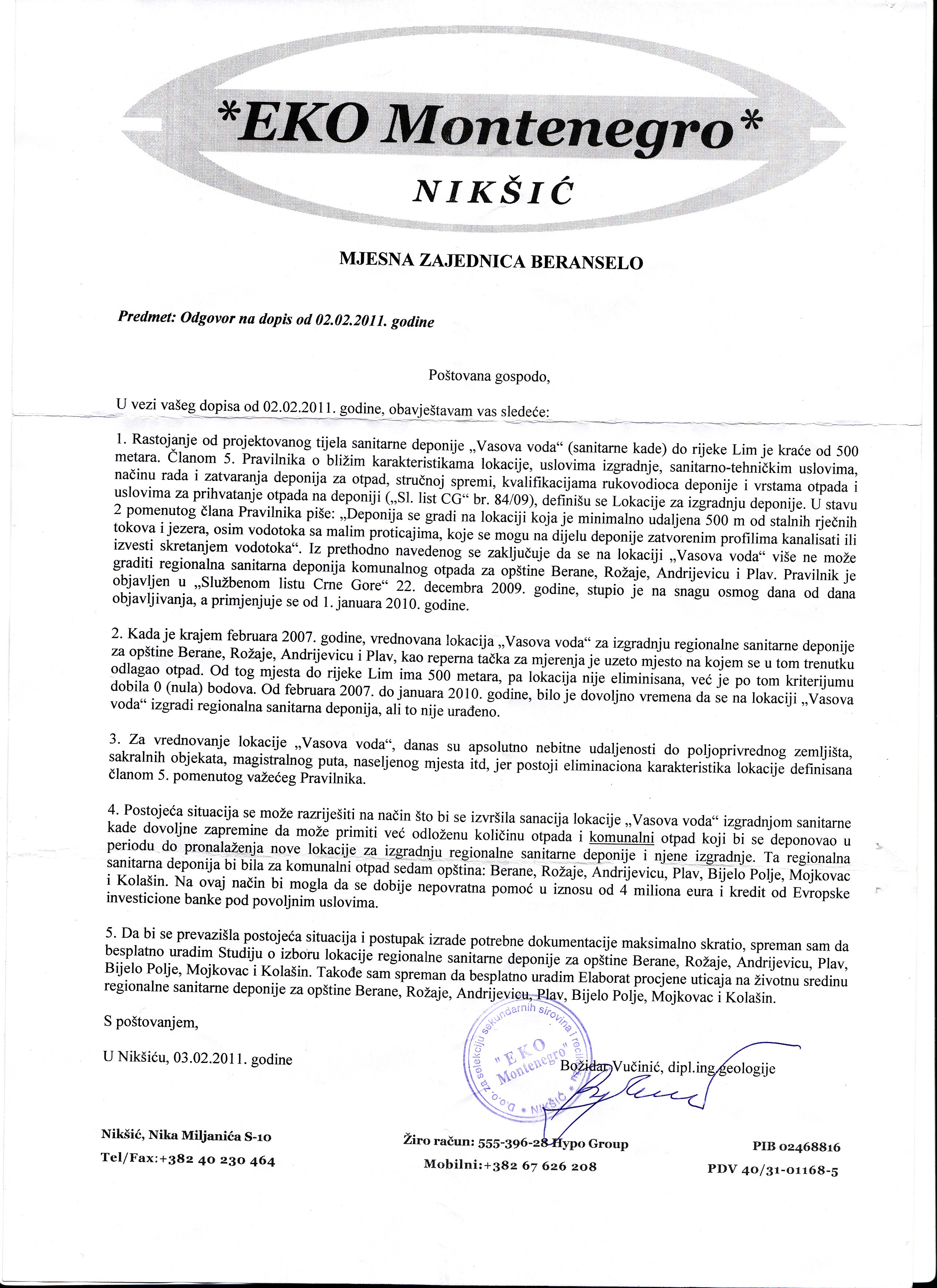 uputili smo zahtjev gospodinu Božidaru Vučiniću iz kompanije Eko Montenegro, koja je bila zadužena za izradu studije lokacije za izgradnju regionalne sanitarne deponije u Beranama, i tražili njegovo stručno mišljenje po pitanju udaljenosti rijeke Lim od projektovanog tijela deponije na Vasovoj vodi. Gospodin Vukčević kaže da se rijeka Lim nalazi na manje od 500m od projektovane deponije, što lokaciju Vasova voda eliminiše kao potencijalnu lokaciju za sanitarnu deponiju, u skladu sa zakonom Crne Gore. Prilažemo kompletan odgovor gospodina Vučinića.