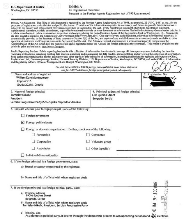 William Montgomery je angažovan od oktobra 2010. godine, a ugovorom se obavezao da će Nikoliću davati “savjete vezane za američku vanjskopolitičku agendu”, “pregled aktuelne politčke situacije iz međunarodne perspektive”, “savjete o najboljim metodama kako bi SNS bio doživljen kao legitimna evropska demokratska partija potpuno sposobna da igra vodeću ulogu u Srbiji i regionu“.