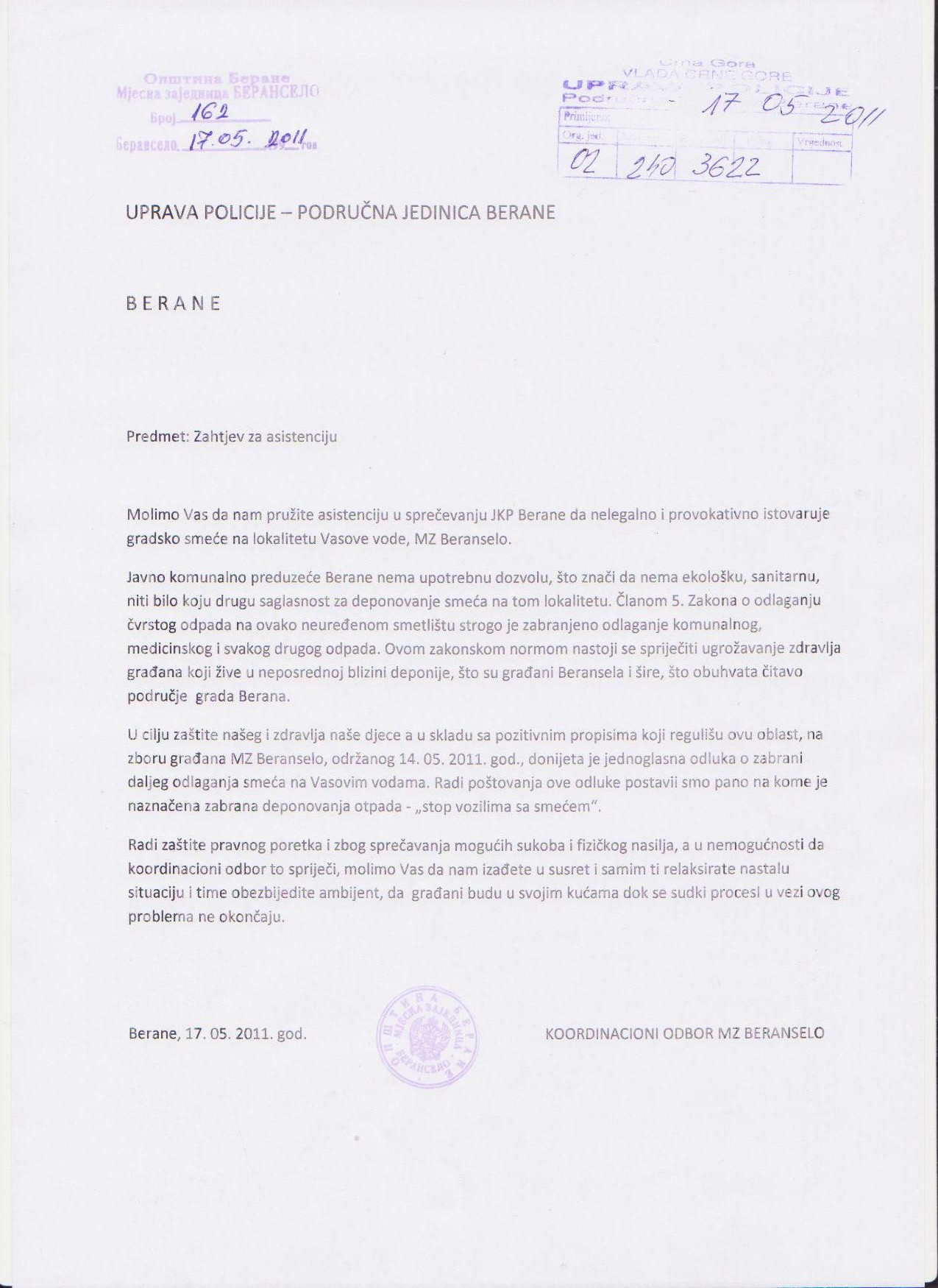 Jovan Lončar: “Opština Berane traži “asistenciju” policije da razbije blokadu. Ovaj dopis smo mi juče predali policiji.” 18.Maj 2011.Mještani su istakli da će odustati od blokade kad dobiju čvrste garancije da će se pristupiti hitnoj sanaciji smetlišta i odabiru druge lokacije za izgradnju regionalne deponije.