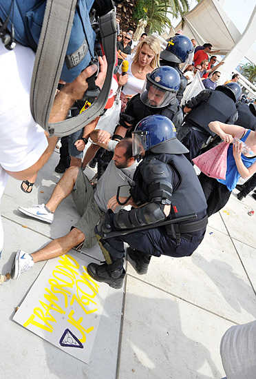Uz povike »nakaze«, »ubi, ubi Srbina« i »ubi, ubi pedera« i glasno hukanje u jednom trenutku se činilo da će razjarena gomila potisnuti policiju i cijelu povorku natrag uz Marmontovu, no specijalci su tad krenuli naprijed i u »marice« odvodili po nekoliko rabijatnih, mahom golobradih, mladića. Na koncu su sudionici Gay Pridea između policijskih kordona uspjeli stići do sredine Rive gdje je bio predviđen ograđeni prostor za održavanje skupa. To međutim nije bilo dovoljno da se skup doista i održi jer je gomila ubrzo doslovno opkolila taj dio Rive. Policija je zatim u nekoliko navrata, klasičnih manevara za nogometne utakmice visokog rizika, odgurala okupljene prosvjednike na sigurnu udaljenost. Ipak, od govora nije moglo biti ništa pa je Gay Pride i službeno prekinut koju minutu iza 16 sati. Muke svih u ograđenom prostoru nisu s time prestale, jer je trebalo osigurati, doslovno, evaukaciju. Uličice samog središta grada policija je osiguravala kako bi sudionici Gay Pride stigli su policijskih automobila i kombija kojim su ih potom odvozili na sigurno.
