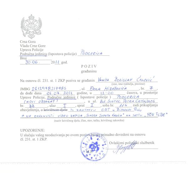 2. cg policija nekoga(da na tren zaboravimo da je to Vanja) privodi na informativu, zbog klipa koji je na youtube-u, dakle, hey,