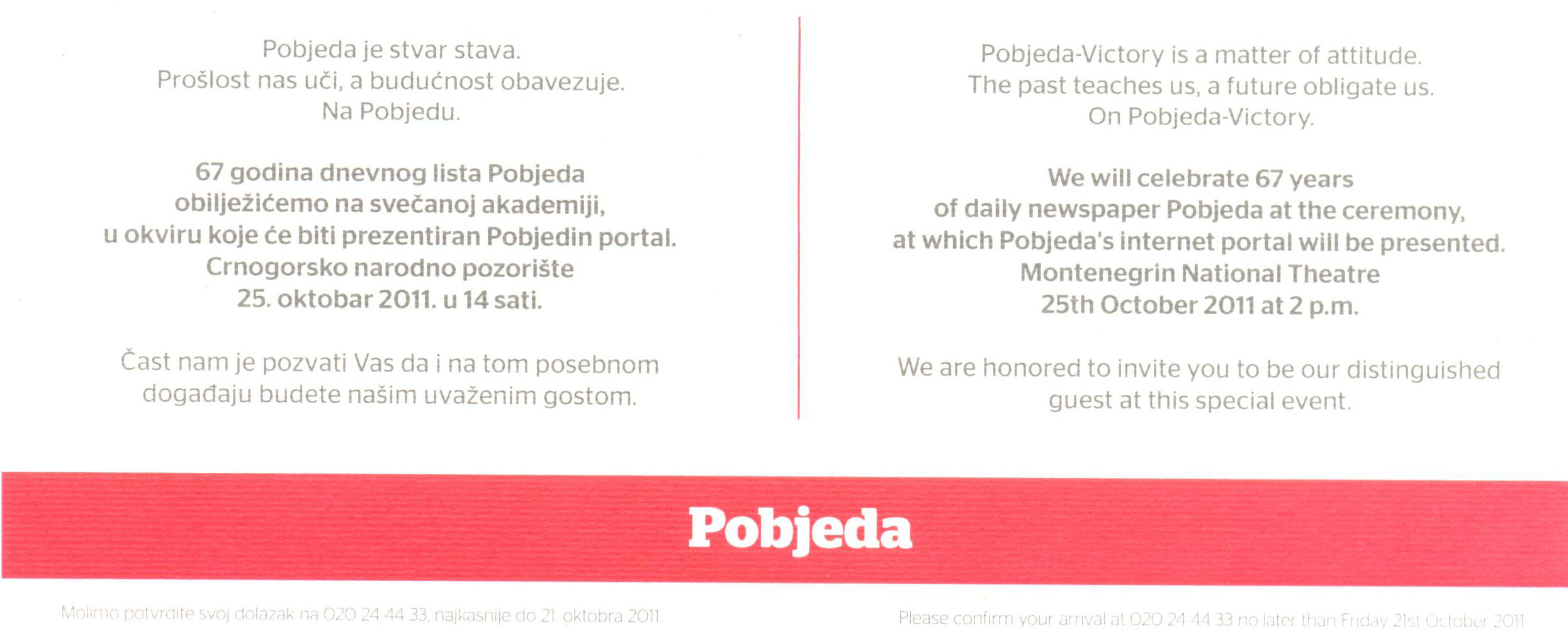 Pozivnica dnevnog lista Pobjeda povodom obilježavanja 67. godina postojanja.
