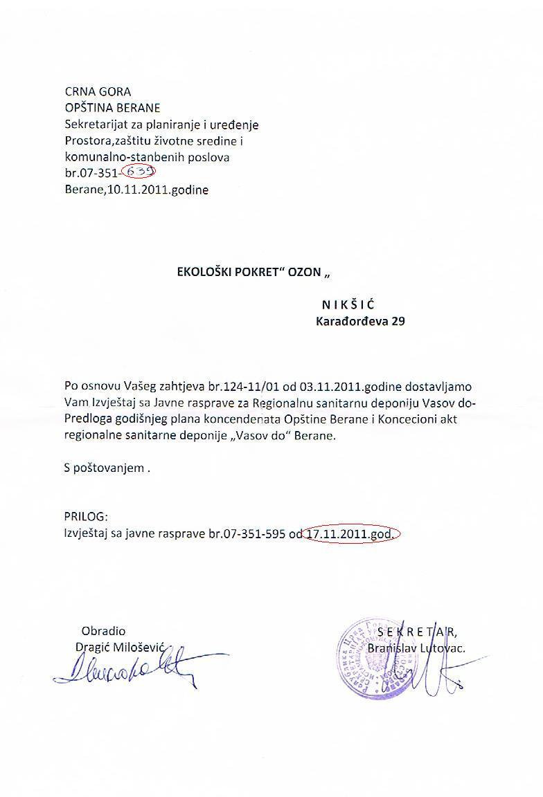 Ekološki pokret ,,OZON“ nakon dobijenih dopisa od strane lokalne uprave opštine Berane, tačnije Sekretarijata za planiranje i uređenje prostora, zaštitu životne sredine i komunalno-stambene poslove koji su puni tehničkih nepravilnosti nelogičnosti, poput datuma kada su pisani, odnosno rednih brojeva pod kojima su zavedeni i ne pružaju nijedan valjan argument zbog čega nijesu prihvatljivi komentari i sugestije koje smo dostavili u toku javne rasprave za Koncesioni akt regionalne sanitarne deponije ,,Vasov do“, kako se sada u krugovima lokalnih funkcionera ,,zvanično“ naziva deponija opasnog otpada na Vasovoj vodi, smatra da je javna rasprava sprovedena na neprimjeren način i da nije suštinski ispunila namjenu, te da je novac poreskih obveznika opet potrošen na neodgovarajući način i da nije zaštićen javni interes.