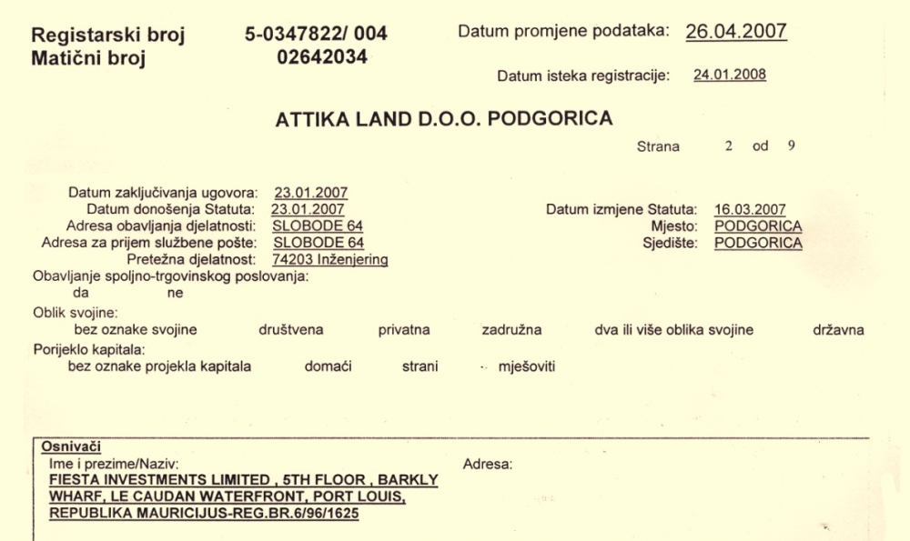 Prvi trag u zvaničnim dokumentima koji bi vrlo lako mogao dovesti do pravog gazde Fieste investments Ltd. je dokument iz podgoričkog Privrednog suda, odnosno, statusna promjena za firmu Attika Land DOO iz prve polovine 2007. godine.