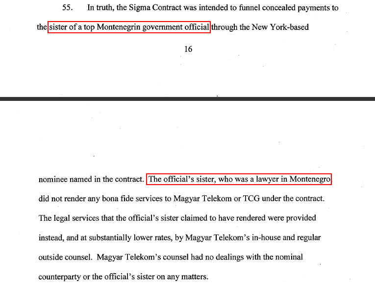 U tužbi američke Komisije za hartije od vrijednosti stoji da su podmićivanje u Crnoj Gori u ime Mađar Telekoma omogućila tri direktora, od kojih su dva bili i članovi uprave Crnogorskog Telekoma nakon privatizacije, preko četiri lažna ugovora o konsultantskim uslugama, ukupne vrijednosti sedam miliona i 350.000 dolara.