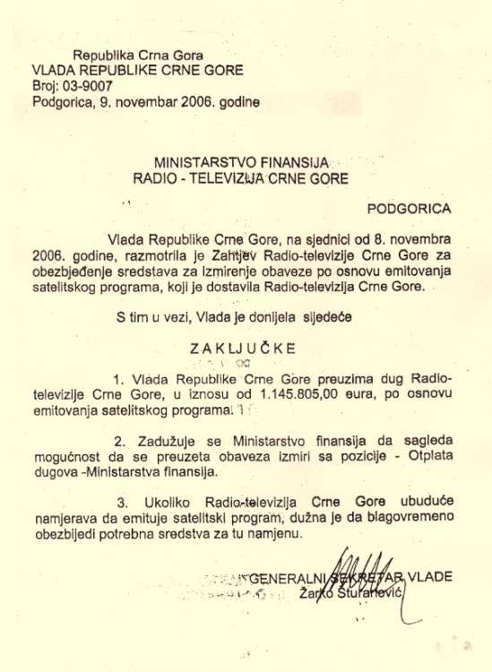 Treći trag je u zvaničnim dokumentima Vlade Crne Gore od 8, odnosno, 9. novembra 2006. godine. Radi se o Zaključku Vlade da od Radio-televizije Crne Gore preuzme dug u iznosu od 1.145.805 eura po osnovu emitovanja satelitskog programa.