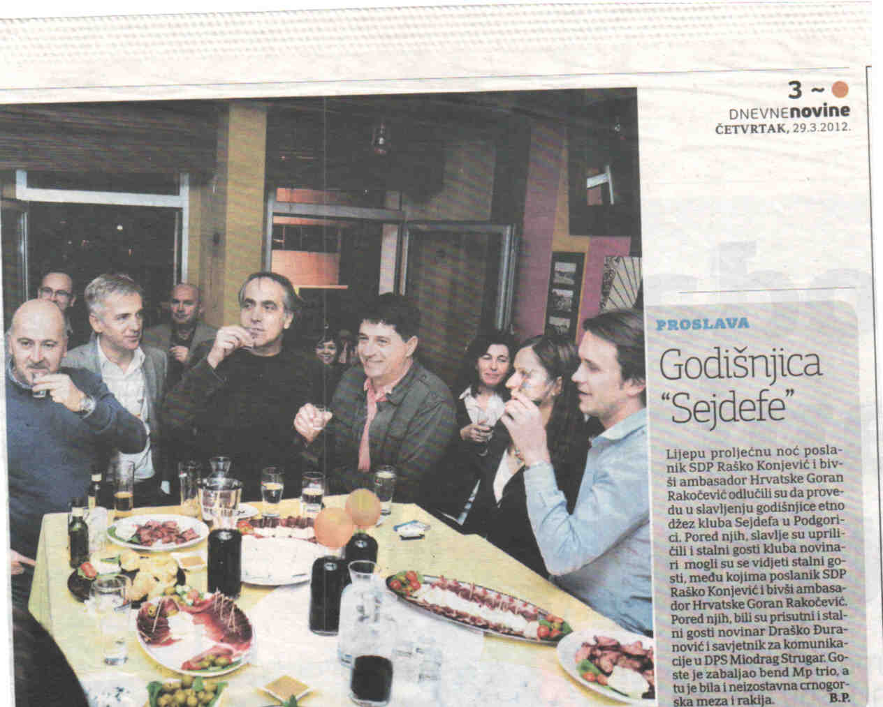 “Lijepu proljećnu noć poslanik SDP Raško Konjević i bivši ambasador Hrvatske Goran Rakočević odlučili su da provedu u slavljenju godišnjice etno džez kluba Sejdefa u Podgorici. Pored njih, slavlje su upriličili i stalni gosti kluba novinari mogli su se vidjeti stalni gosti, među kojima poslanik SDP Raško Konević i bivši ambasador Hrvatske Goran Rakočević. Pored njih, bili su prisutni i stalni gosti novinar Draško Đuranović i savjetnik za komunikacije u DPS Miodrag Strugar. Goste je zabaljao bend Mp trio, a tu je bila i neizostavna crnogorska meza i rakija.”