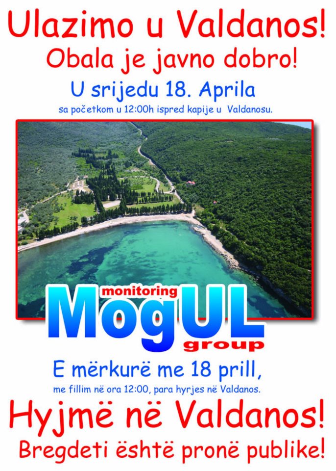 Nevladina organizacija Monotoring group Ulcinj (MogUL) je pozvala “sve aktiviste organizacija civilnog društva i sve slobodne građane kojima je stalo do korišćenja Ustavom i zakonima zagarantovanih prava o slobodi kretanja, mirnog okupljanja i neometanog pristupa javnom dobru“, da im se pridruže u uličnom performansu Ulazimo u Valdanos! Obala je javno dobro!