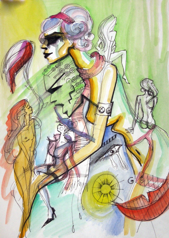 – srednja škola. Do nje sam već bila sigurna da sam sve što se može kopirati već iskopirala i tu je počeo da se razvija onaj banalan impuls – biti originalan. Tu sam i prvi put postala jasno svesna te “manije gonjenja”. Učila sam uveče i do jutra ostajala budna besomučno crtajući dok svi spavaju. Tempera, suvi pasteli, tuš i akvarel. Razvlačila sam štrik po sobi i štipaljkama kačila te slike, jer više nije bilo mesta gde da se spuste dok se osuše.