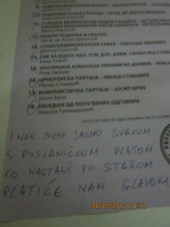4.5% nevazecih mogli su u parlament da udju da su htjeli. Sto je sa onim dikama crnogorskim nikako da provalim. Patriotski mediji su danima javljali predali listu, dopunili listu, potvrdili listu, po opstinama ovo ono, Stevovic ocekuje cuda ..