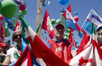 Okupljeni su nosili šarene balone i zastave sindikata, a stariji radnici žalili su se da ne mogu da sastave kraj s krajem od svojih penzija, na povećanje poreza, kao i da njihova deca imaju male šanse da se zaposle, preneo je AP.