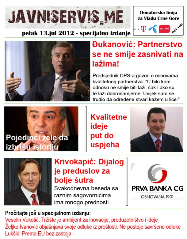 2. Kakve mudrosti izlaze iz ovijeh glava, covjek naprosto ne moze a da odabere kojemu pripada trinaestojulska, jer svaki je na svoj nacin doprinijeo da Crna Gora bude primjer cijelom svijetu po mnogo cemu,a posebno po nastojanju da partnerstvo ne smije biti zasnovano na lazima, kao i da svakodnevna besjeda sa raznim sagovornicima ima prednosti…vau, bitka za Crnu Goru se nastavlja preko trinaestojulske, pa nestrpljivo cekamo specijalno izdanje i neka bude iz Herceg Novog, jer tamo su obecali biracima DPS-a trinaestoljulsko kupanje u novom bazenu na Skveru, za koji je utroseno 5 milona eura, za 5000 glasova, a sve uz slogan: kvalitetne ideje su put do uspijeha preko Prve banke, osnovane od trinaestojulske nagrade, zasluzene do posljednje kapi krvi i cigare.