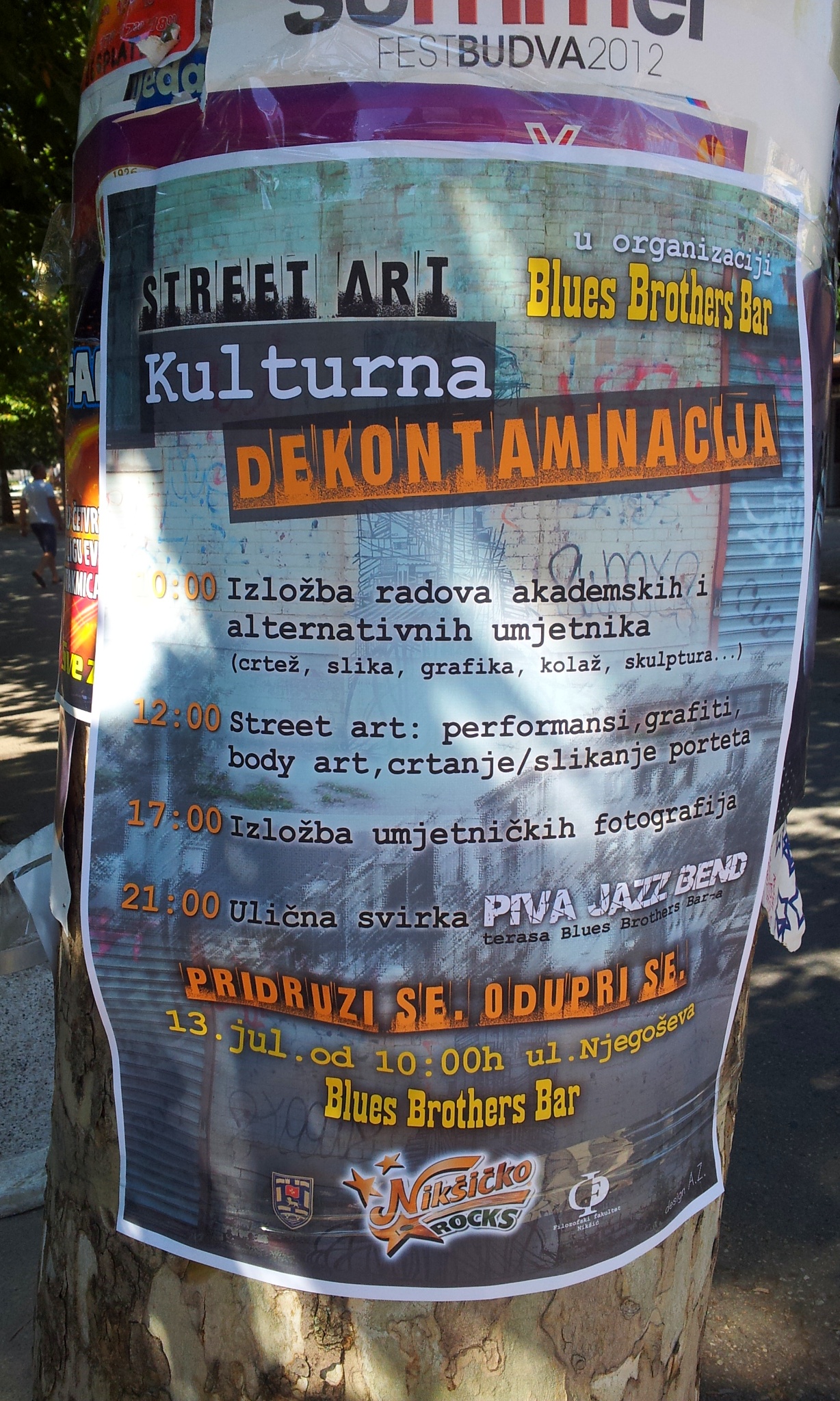 Danas, 13. jula, 2012. godine, u Nikšiću je, kao i u ostalim krajevima Crne Gore, veoma svečana atmosfera. Tim povodom danas se u ovom gradu okupio veći broj mladih, slobodnih/slobodoumnih umjetnika i zaljubljenika u umjetnost. Na otvaranju manifestacije KULTURNA DEKONTAMINACIJA, koju je organizovao Blues brothers bar, a pod pokroviteljstvom opštine Nikšić & Filozofskog fakulteta Nikšić, prisutnim umjetnicima se obratio gradonačelnik Nebojša Radojičić.