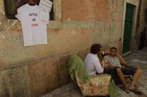 Druga grupa studenata subverzivno afirmiše poziciju potencijalno “gladnog” umetnika ili studenta umetnosti u društvu koje ga tera da odgovori na pitanje: “Kada ćeš konačno početi da radiš nešto normalno, tj. nešto što će ti doneti novac?” To pitanje je ne samo u crnogorskim okolnostima, već na globalnom planu u doba recesije postalo na nov način aktuelno. Odgovor na to pitanje je bila aktivnost treće grupe studenata u projektu koji ima naziv “Artist at work”, u okviru kojeg su studenti radili sve drugo osim umetnosti (bar na prvi pogled). Tako su prolaznici mogli videti na štandovima studente koji prodaju palačinke, bave se gatanjem, pružaju kozmetičke usluge, rade masažu…