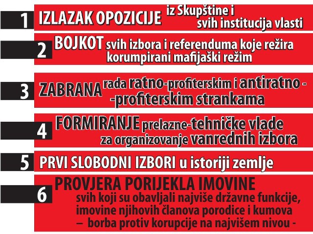 Mirjana Kuljak : Ovo su gradjani koji znaju sto hoce. Ne cekaju RTVCG, ni govornika, ni “opoziciju” da im kaze sto da zahtijevaju!!! Tako je, tacke: 1, 2, 3, 4, 5, 6! To je put za skidanje mafije s vlasti! Rece neko danas: “Ako nas nema dovoljno da smijenimo vlast, ima da smijenimo “opoziciju!”