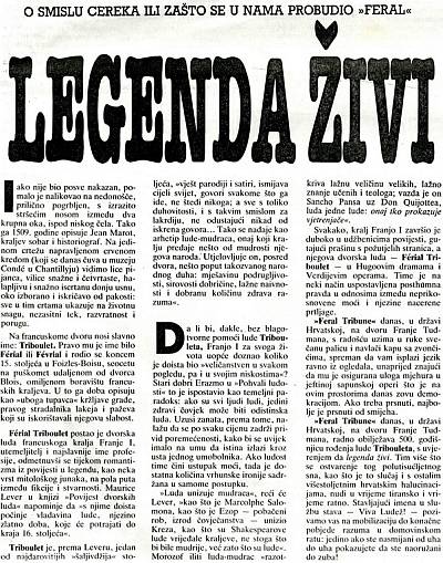 10Prije ravno 20 godina na kioscima se pojavio prvi broj lista Feral Tribune. “Glasilo hrvatskih anarhista, protestanata i heretika (Bogu-mili a ni vragu nisu mrski)“ i list “oslobođen osnovnog nameta na pamet“ ne samo da će u 15 godina izlaženja ostaviti dubok trag na medijskoj sceni, već će postati i nužni korektiv društva. Tim povodom Lupiga je svojim čitateljima priredila prilično opširan temat, u sklopu kojeg ćete imati priliku pročitati priču o Feralu, vidjeti najbolje naslovnice lista, iščitati opsežne razgovore s njegovim utemeljiteljima – Viktorom Ivančićem, Predragom Lucićem i Borisom Dežulovićem. Svoj prilog dali su nam i Ivan Lovrenović, ali i svjedok tog vremena Stjepan Mesić.