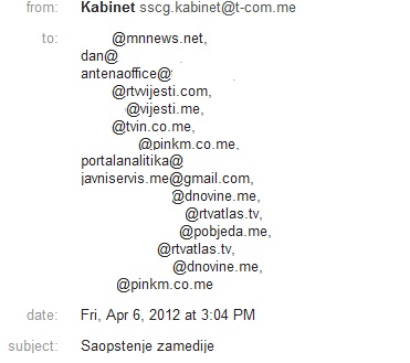Koristimo priliku da Zorana Masoničića i Savez Sindikata Crne Gore informišemo da od svih medija u Crnoj Gori prilikom slanja svojih saopštenja preskaču jedino email onog javnog servisa. Sudeći po sadržaju saopštenja i suštini aktivnosti SSCG-a, sigurno se radi o propustu ili permutaciji servisa, stoga dobronamjerno sugerišemo Zoranu Masoničiću da ažurira kontakt listu. Ukoliko se email sajta javniservis.me ne nađe na ažuriranom spisku, većinom glasova obećavamo da to nećemo pogrešno shvatiti, naprotiv! Saopštenja SSCG-a dobijamo u kontinuitetu od 13.novembra 2011. i do sada su tek dva odobrena od  strane uređivačkog kolegijuma. Razlog današnjeg odobravanja  je pominjanje imena slavnog Rajka Kovačevića u saopštenju. Kontekst nebitan, kao i sjajna saopštenja SSCG-a.